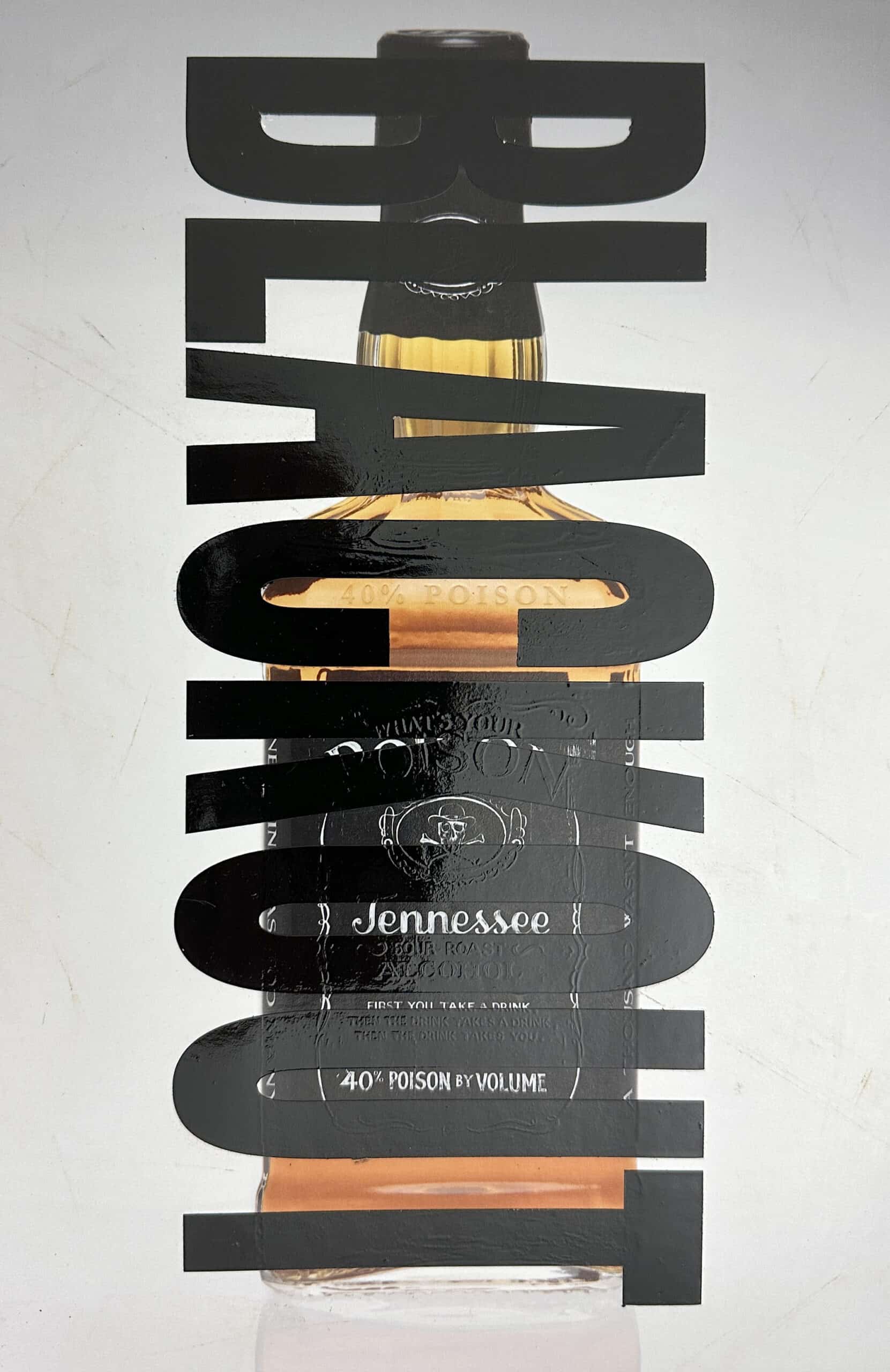 This is “Tennessee 40% Poison” oil over-painted with the word BLACKOUT then lightly distressed. The only thing visible in the darkness of BLACKOUT is the bottle, clearly embossed within. This original artwork is 8″ by 12″ – if you want to commission a larger painting send me a message.