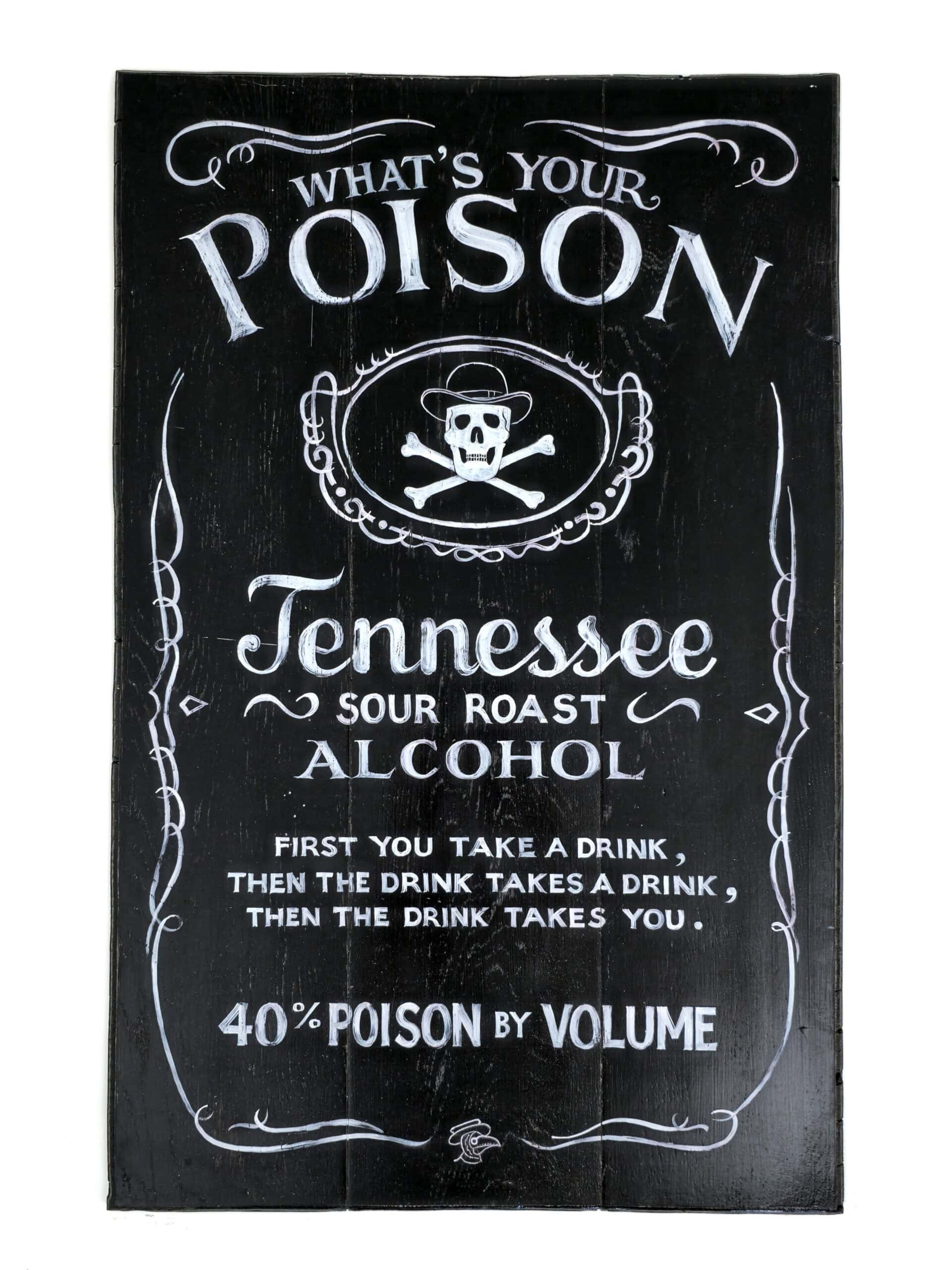 I liked bourbon way too much and I ended up pretty much giving up spirits – at least at home – because of it. My very first artwork in the “What’s Your Poison?” series was a Tennessee oil painting on a table top.